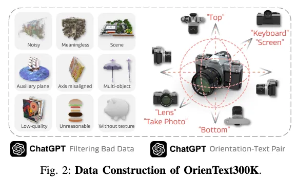 앞선 문제 정의에서 중요한 포인트는 결국 open-world 환경에서 semantic orientation을 추론할 수 있는 범용 모델을 학습해야 한다는 것이었습니다. 이를 위해 저자들은 OrienText300K라는 새로운 대규모 데이터셋을 구축합니다. 핵심은 단순히 3D 객체 모델을 모으는 것이 아니라, 거기에 의미론적 방향(semantic orientation) annotation을 붙여 언어와 방향을 연결한 학습 데이터를 만드는 데 있습니다.