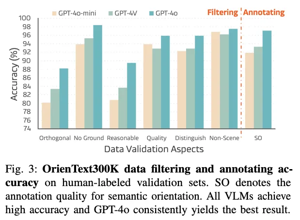 2. Quality Validation 마지막으로 검증을 위해 208개 샘플에 대해 사람이 직접 라벨링한 validation set을 만들고, GPT-4o가 필터링과 어노테이션을 얼마나 잘 수행했는지 확인했습니다. 그 결과, Filtering 정확도 88.3%, Annotation 정확도 97.1%로, 신뢰할 만한 수준임을 피력했습니다.