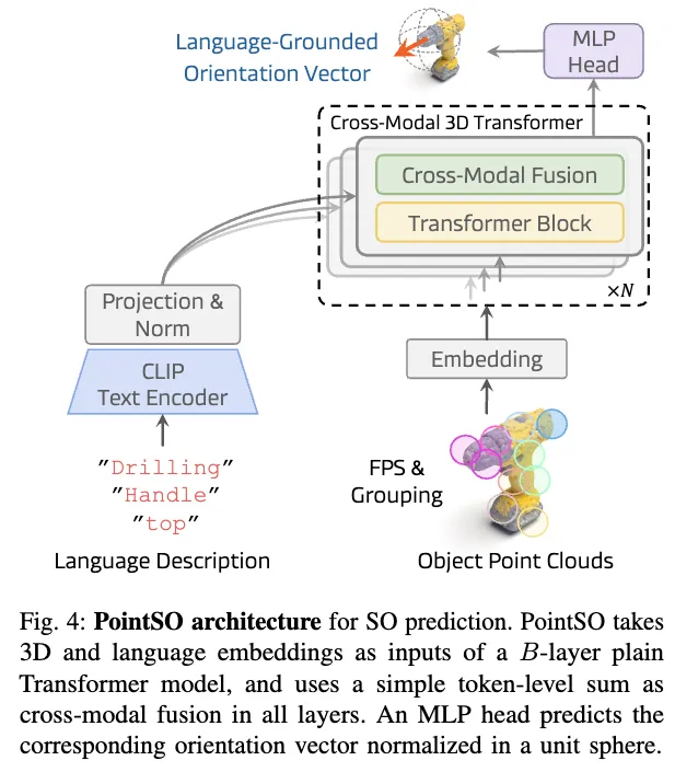 저자들이 제안하는 핵심 모델은 PointSO라는 cross-modal 3D Transformer 기반 아키텍처입니다. 큰 그림은 간단합니다. 객체의 3D 포인트 클라우드와 언어 설명을 동시에 입력받아, 그에 대응되는 semantic orientation을 출력하는 구조입니다.