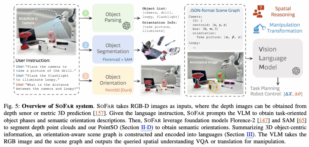 앞서 저자들의 제안 모델인 PointSO는 object-centric한 공간적 방향성 이해를 위한 off-the-shelf 솔루션을 마련했지만 이러한 객체 중심 공간 이해를 scene-level의 공간 추론으로 확장하는 방법은 여전히 불분명했고, 이를 high-level에서의 VQA 이해와 물리적인 조작 관점 모두 고려하며 끌고 가기 위해서 Florence2 + SAM과 VLM을 결합한 파이프라인 형식을 취하게 됐습니다.