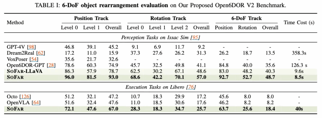 Perception track에서는, 원래 Open6DOR 실험에서 사용된 동일한 베이스라인과 결과를 비교했다하는데, SOFAR는 모든 베이스라인을 능가하며, 효과적인 공간 이해 능력과 zero-shot generalizability를 보입니다. 다만 저희 팀이 voxposer의 속도를 짧게 경험해본 입장으로서는, 다른 벤치마크 환경에서의 gpt-4v와 voxposer에 대한 time cost를 리포팅하는 게 어려운 건 아닌 것 같은데, 안한 점이 조금 아쉽네요.