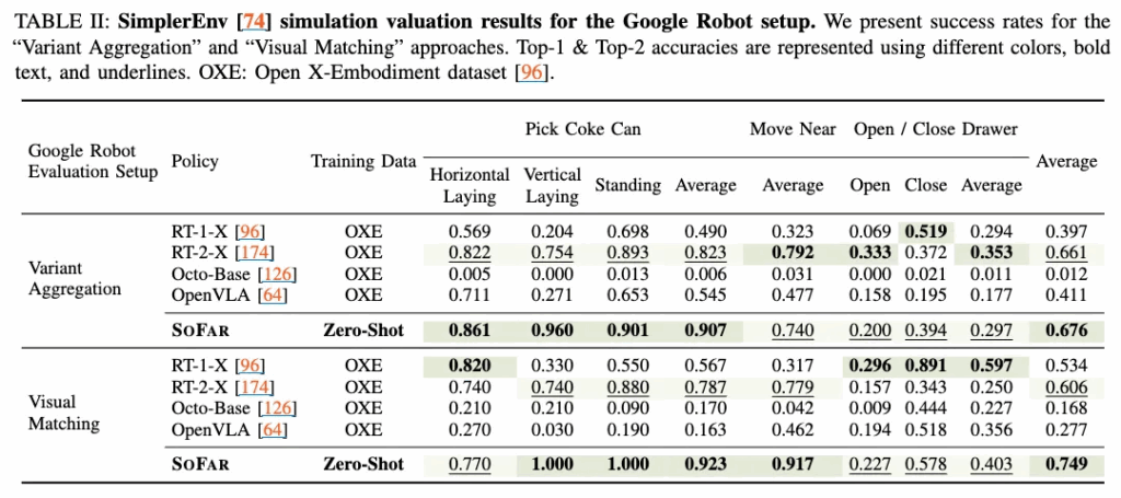 Table 2,3 전반에서 SoFAR가 대부분의 베이스라인(Octo, OpenVLA 등)을 앞서는데, Google Robot 세트에서 평균 성능은 가장 높고, Pick Coke Can / Move Near 류의 단순 변환 태스크에서 강세를 보이는데, 오히려 저자들이 물체의 semantic한 방향을 고려한 액션 태스크에 해당하는 open/close drawer같은 경우는 생각보다 낮은 성능을 보였습니다. 이건 약간 저자들의 설계한 방향과 반대되는 결과이기에 좀 의아하긴 한데, 생각해보면 결국 아무리 high-level에서 물체중심의 semantic orientation을 잘 추정했다고 해도, low-level action이 OMPL 기반의 motion planning 이라는 게 Failure 요소로 작용하지 않았을까 싶습니다.