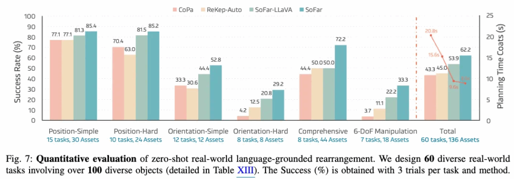 Fig. 7 기준, SoFAR는 대부분 트랙에서 CoPa, ReKep-Auto를 상회하는데, 특히 Orientation-Hard, Comprehensive, 6-DoF 트랙에서 격차가 컸습니다. 총합 성공률에서도 우위이며, 플래닝 시간 오버헤드는 제일 낮았습니다.