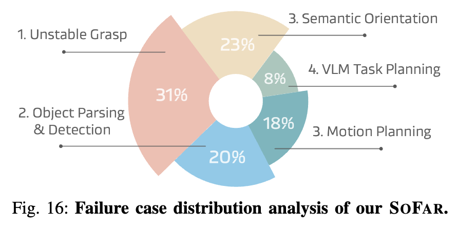 특히 failure case의 경우 사실상 unstable grasping과 object parsing, motion planning의 실패 결과가 절반 이상의 비율을 차지하는 것으로 보았을 때, 결국 GSNet과 OMPL, Florence2+SAM 등의 off-the-shelf 모듈들을 사용하는 것으로 인해 일정부분 감수해야되는 결과가 아니었나 싶습니다. 그래도 저자들이 주로 손댄 semantic orientation도 23%의 비율로 실패율을 차지하는 것을 보면 해당 부분에서도 여전히 개선할 여지가 다분하다로 유추해볼 수 있겠습니다.