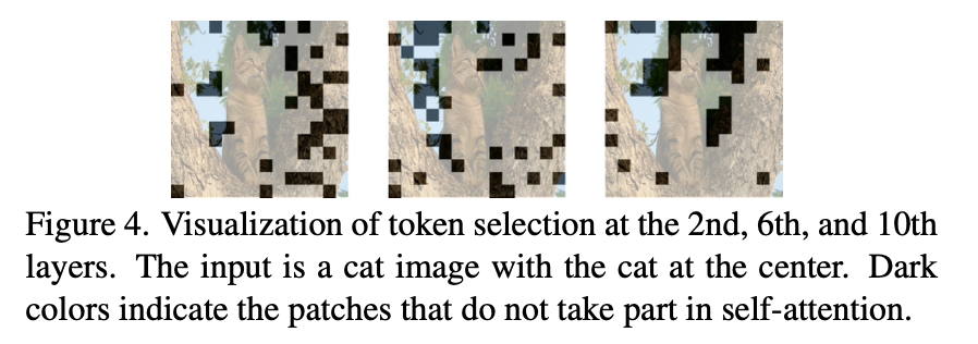 궁금한점이 있는데 ImageNet에서의 연산량 감소하는 부분에서 사전에 토큰 셀렉터가 학습되는 과정까지 포함된 수치인지 궁금합니다. 그리고 figure4는 흠 뭔가 신기하기는 한데 해당 모델구조의 어떤 부분이 저런 결과를 만들었을지 신기하네요.. 배경 부분을 각 레이어가 다르게 선택하는 것이 우연인지 모델의 설계에 부가적으로 일어난 효과인지에 대한 생각이 궁금합니다.