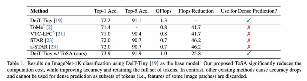 표 1을 보면 T 기존 DeiT-Tiny 같은 경우에는 Top-1 정확도 72.2 GFLOPs 1.3인 것에 반해 ToSA 적용하면 Top-1 정확도 73.9, GFLOPs 1.0로 약 25% 연산량을 줄이면서도 정확도는 오히려 1.7% 향상되는 것을 확인할 수 있습니다. 반면 기존의 ToMe, VTC-LFC, STAR 같은 다른 경량화 기법들은 FLOPs는 더 많이 줄였지만 정확도가 하락했고 무엇보다 토큰을 실제로 버려버리거나 병합하기 때문에 픽셀 단위 정보가 사라지기 때문에 특히나 dense prediction에는 쓸 수 없는 구조적 한계가 있습니다.
