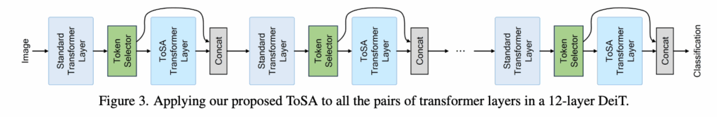 일단 논문에서 다룬 것은 백본으로 제일 작은 DeiT-Tiny (12층 ViT)만을 사용해서 평가하였습니다. ToSA는 2, 4, 6, 8, 10번째 레이어에 적용했고, 각 ToSA 레이어에서는 토큰의 상위 80%만 self-attention에 참여하도록 설정했다고 보시면 될 것 같습니다.