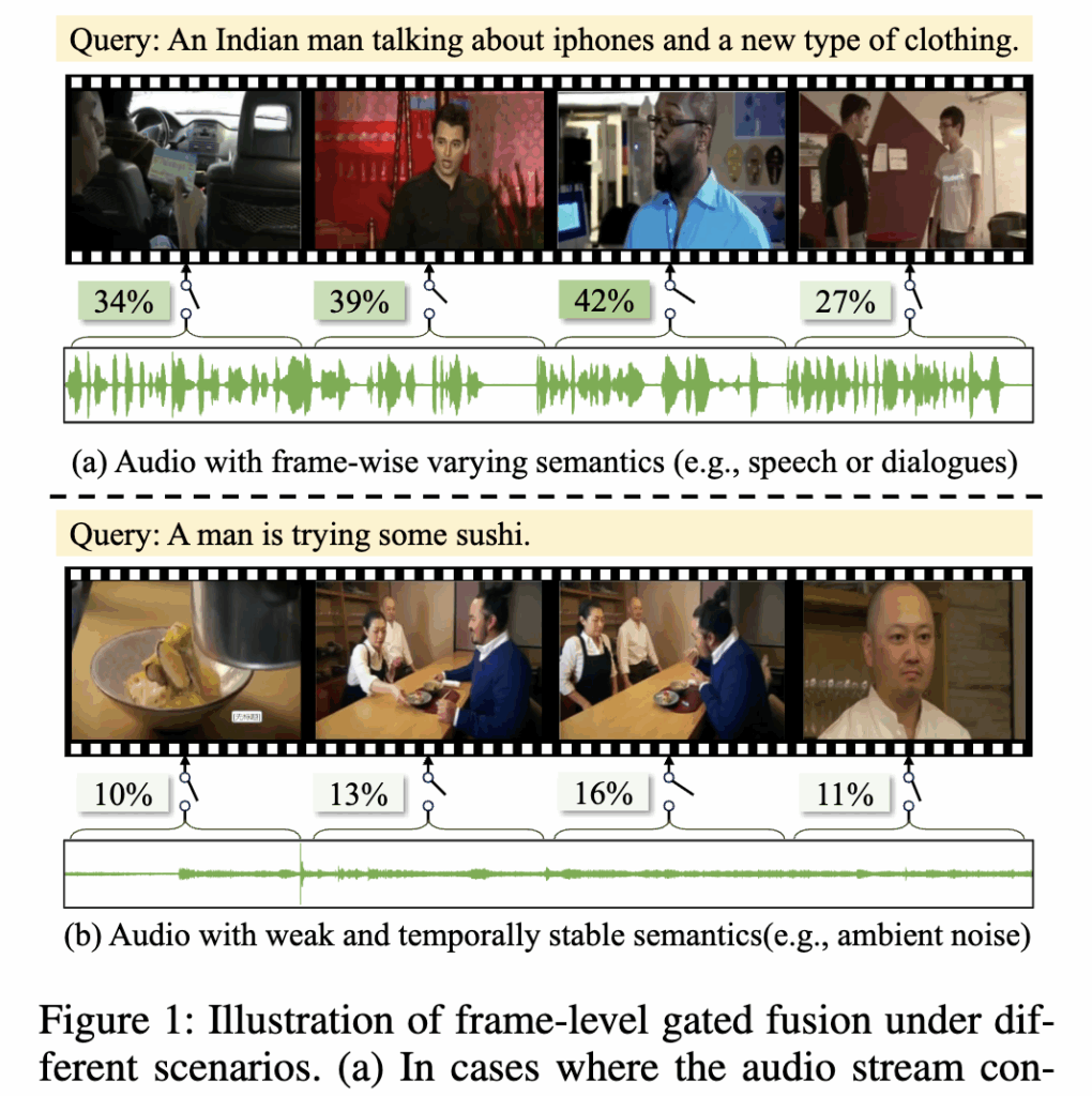 Figure 1은 저자가 언급한 문제를 보여줍니다. (a) 프레임마다 의미가 변하는 오디오 대화나 특정 소리 효과가 들어있는 경우, 프레임마다 오디오의 중요도가 달라집니다. 이때는 오디오가 의미를 구분하는 데 큰 도움이 되기 때문에, 모델이 오디오에 높은 가중치를 주도록 학습해야 합니다. (b) 의미가 거의 없는 오디오 배경 소리나 주변 잡음처럼 의미 없는 소리가 지속되는 경우에는 오디오가 검색 정확도를 방해할 수 있습니다. 이럴 땐 오디오의 비중을 줄여야 하죠. 즉, 오디오가 항상 중요한 것은 아니며, 프레임마다 오디오의 중요도를 조절하는 게 필요하다는 점을 확인할 수 있습니다.