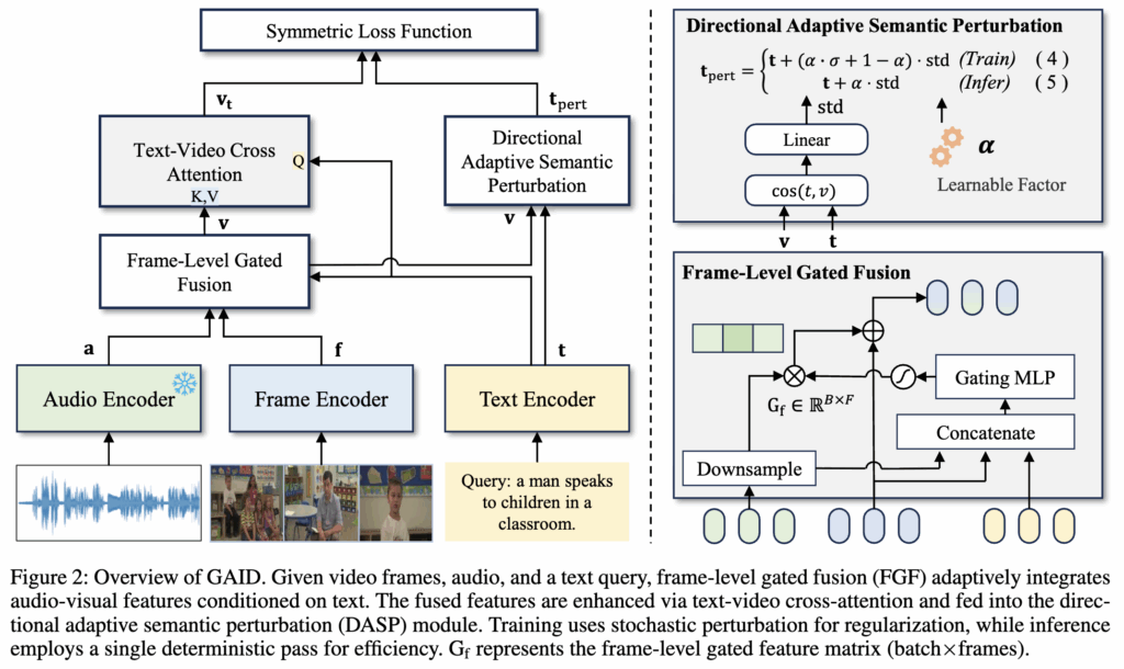 GAID는 텍스트-비디오 검색에서 오디오 정보를 활용하고 노이즈를 추가하여 텍스트 임베딩을 안정화함으로써 검색 성능을 향상시키는 프레임워크입니다. 기존 연구들은 대부분 시각 정보에만 의존하거나 오디오를 단순히 합치는 수준에 머물러 있어 중요한 맥락 정보를 놓칠 수 있었습니다. 또한 텍스트 임베딩은 누락된 프레임이나 잡음에 쉽게 영향을 받아 검색 성능이 불안정했습니다. 이를 극복하고자, 첫째 Frame-level Gated Fusion (FGF)에서 프레임 단위로 오디오와 비주얼 정보를 동적으로 조합하여, 중요한 대화나 소리 구간에서는 오디오에 더 높은 가중치를 주고, 불필요한 잡음은 억제하도록 설계했습니다. 둘째 Directional Adaptive Semantic Perturbation (DASP)에서 비디오와 텍스트 간의 차이를 분석해 의미 있는 방향으로만 노이즈를 추가하는 기법으로, STP보다 훨씬 적은 연산량으로도 강건성을 확보했다고 합니다.