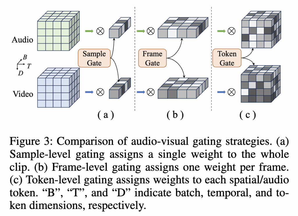기존 연구에서는 비디오 전체에 동일한 가중치를 주는 sample-level fusion이나, 모든 패치나 스펙트로그램 토큰마다 가중치를 계산하는 token-level fusion 방식을 사용했습니다. 상단 그림 3이 바로 그 차이를 설명하는 그림입니다.