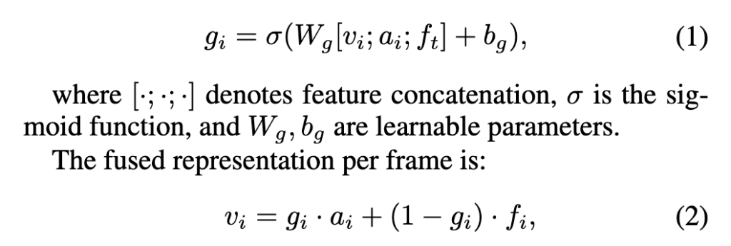 다시 frame-level fusion에 대한 설명으로 돌아가겠습니다. 비디오 프레임 임베딩과 오디오 임베딩, 그리고 텍스트 임베딩을 결합해 각 프레임의 게이트 값 g_i \in [0,1]을 계산합니다. 이후 이 게이트를 사용해 프레임별 오디오와 비주얼 특징을 가중합하여 최종 비디오 임베딩 v를 생성합니다.