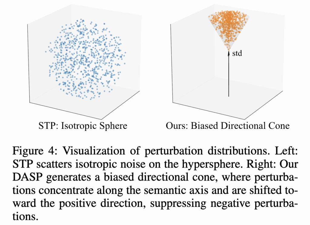 DASP는 콘(cone) 모양의 방향성 영역 안에서만 노이즈를 넣어, 의미를 해치지 않으면서 필요한 변화만 반영합니다.