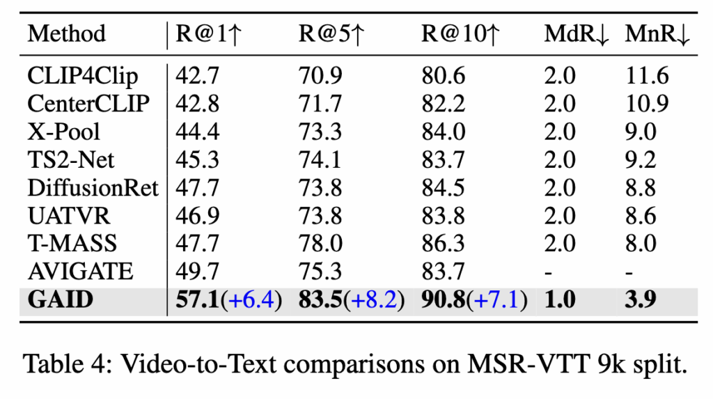 또한 CLIP-ViP처럼 프레임별 텍스트 설명을 추가한 모델보다도 GAID가 모든 지표에서 더 나은 성능을 보여 저자가 제안하는 모듈의 개선을 확인할 수 있었다고 합니다.
