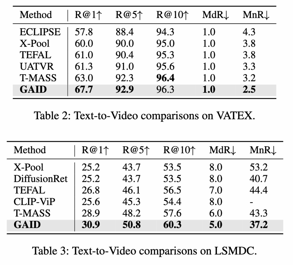 GAID는 MSR-VTT, DiDeMo, VATEX, LSMDC 등 주요 벤치마크에서 기존 오디오 활용 기법(AVIGATE)이나 오디오 비활용 기법(T-MASS, ViCLIP)보다 일관되게 더 높은 성능을 보였다고 합니다.
