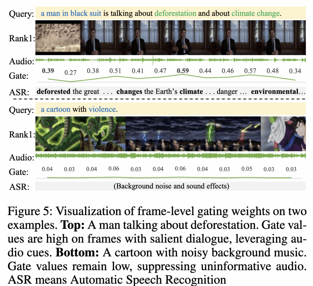Figure 5에서는 프레임 단위 게이트의 동작에 대한 정성적 결과입니다. 대화나 중요한 소리가 있는 구간에서는 게이트 값이 높아지고, 의미 없는 배경 소음이 많은 구간에서는 게이트 값이 낮아지며 오디오를 억제하였다고 합니다. 이를 통해 프레임 단위 융합이 오디오의 중요도를 동적으로 조절해 비디오-텍스트 정렬을 강화한다는 점을 확인할 수 있습니다.