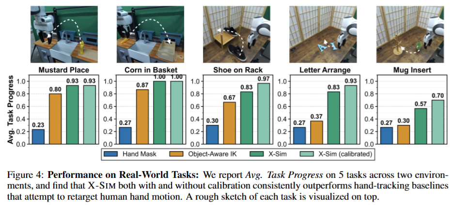 X-sim이 기존의 hand-retargeting approach들의 한계를 해결했는지?에 대해 human hand를 inpatining하는 기법들과 IK를 통한 retargeting을 하는 방법론들을 baseline으로 삼아 평가를 진행했습니다. Baseline 방법론들 모두 시뮬레이션을 활용하지 않고, 사람의 행동을 로봇이 다 재현할 수 있다는 가정을 통해 진행했기 때문에 시각적, 역학적 gap의 한계를 극복하지 못 했다고 합니다. Hand mask의 경우 baseline으로 PHANTOM이라는 방법론을 사용했습니다. Human Video에 손을 검은색으로 색칠해서 object를 따라가게 하고 inference시에도 유사하게 로봇팔을 검은색으로 색칠해서 접근하는 방식이라고 합니다. 당연하게 robot의 observation과 human의 visual gap을 극복하지 못해 approach phase를 넘기지 못 하는 경우가 많았다고 합니다. HAMER라는 손의 trajectory를 추적하고 이를 IK로 따라하는 IK를 통한 접근또한 table top환경에서 kinematic infeasibility가 두드러지며 human motion을 직접 모방할 수 없었다고 합니다. 해당 baseline들은 x-sim이 calibration 없이도 일관되게 더 높은 성능을 달성했다고 합니다
