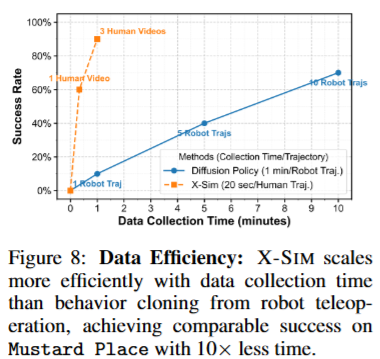 3. Data Efficiency — teleoperated robot data로 학습한 behavior cloning(BC) 대비, 데이터 수집 시간이 늘수록 X-SIM 성능은 어떻게 스케일링되는가?