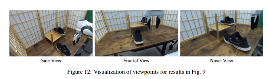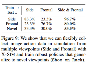 여기선 inference시에 view point에 대한 일반화 실험을 진행했습니다. 신발을 지정된 랙에 정렬하는 pick and place 실험인 shoe on rack task를 가지고 평가했고, 기존의 image conditioned policies가 viewpoint에 굉장히 민감해서 여러 카메라 view에 대한 추가적인 데이터 수집이 필요하다는 점을 어필했습니다. 따라서 아래와 같이 Side, Frontal viewpoint에서 렌더링 하며 데이터를 취득해 side, frontal 만 가지고 학습했을 때 보다 각각의 viewpoint와 더불어 Novel viewpoint에서도 더 높은 성공률을 기록했습니다. 이 점이 시뮬레이션의 큰 강점중에 하나인 것 같습니다.