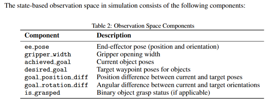 이제 구성된 재료들을 가지고 human video에서 정의된 태스크 (객체의 궤적을 잘 추적하는 액션 수행)을 로봇이 잘 수행하도록 obejct-centric reward를 기반으로 시뮬레이터에서 privileged-state RL을 진행합니다. 대부분 real to sim to real에서 사용하는 기법으로 현실에서 얻을 수 있는 state 외에 다양한 시뮬레이터에서 직접 얻어올 수 있는 값들을 통해 효율적인 강화학습을 진행합니다. 이렇게 학습한 정책을 시뮬레이터에서 그대로 수행하며 로봇 위치, 객체 위치, 뷰포인트, 조명을 다양화 하며 시뮬레이터 내의 카메라를 통해 image-action pair데이터셋을 구성합니다. 여기서 생각해보니 사실 시뮬레이터의 가장 큰 이점은 privileged state이고 이는 강화학습의 효율성과 직결되는 문제인데, 왜 시뮬레이션에 집중하면서 강화학습은 멀리했을까,, 하는 생각이 들기도 했습니다. (해당 연구가 oral이니까 뒤늦게 이런 생각이 드는것 같기도 합니다 ㅋㅋㅋ) 아래 사진은 observation으로 활용한 시뮬레이터 상의 privileged information들입니다.
