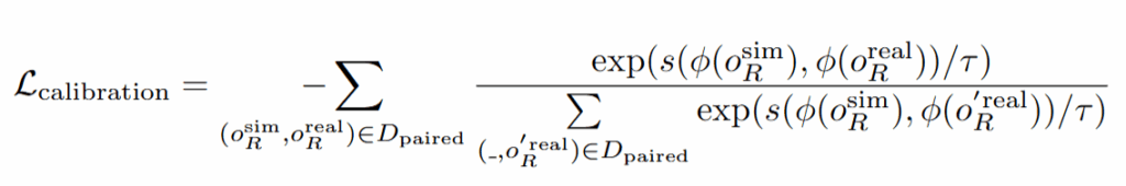 Calibration 대상은 policy의 observation encoder입니다. Synthetic data를 통해 imitation learning을 진행한 뒤에 우선 real 환경에서 inference를 진행한다고 합니다. 이 때 task를 real환경에서의 task 성공 유무와 관계없이 행동하는 동안의 state-action pair를 취득하고, 해당 action을 물체의 위치가 real환경과 동일한 세팅으로 세팅된 시뮬레이션 환경에서 그대로 rollout해줍니다. 동일한 세팅은 foundationpose를 통해 얻은 6D를 그대로 시뮬레이터에 적용했다고 합니다. (어쨌든 현실-시뮬레이터간 좌표계 문제는 해결을 한 것인가..) 여기서 rollout을 현실과 그대로 진행하면서 얻은 시뮬레이션의 이미지들과 현실에서 inference를 진행하면서 얻은 이미지들을 paired images로 정의하겠습니다. Paired images를 통해서 policy의 observation encoder를 contrastive learning을 통해 학습시킵니다. 한 쌍에서 각 이미지들은 같은 상태를 나타내는 것이기 때문에, 인코더가 두 이미지를 비슷한 특징벡터로 매핑하도록 학습합니다. 동시에, 다른 상태에서 나온 이미지들은 서로 멀리 떨어진 임베딩을 갖도록 학습합니다. 다른 환경에서의 이미지가 같은 state라면 가깝게, 다른 state라면 멀어지게 학습해서 결국 인코더가 조명이나 texture와 같은 요소들보다 로봇과 물체가 어디 있는지에 집중할 수 있게 해준다고 합니다. Calibration의 loss는 다음고 ㅏ같습니다.