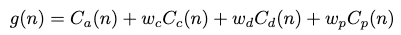 누적 비용 g(n)은 네 가지 항목의 가중합으로 정의됩니다.