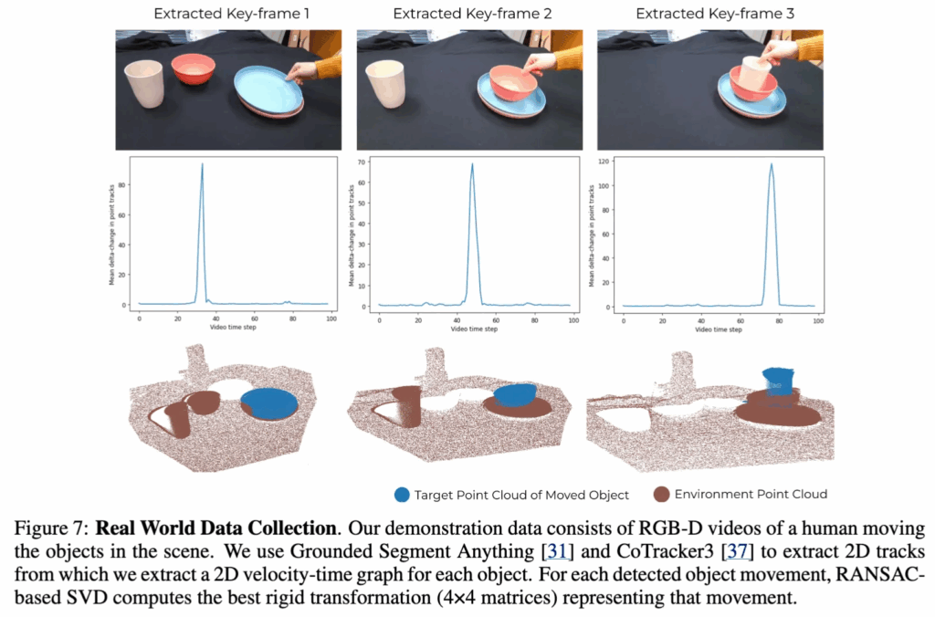 2. 데모 데이터 취득은 동일한 물리적 도메인(같은 테이블/선반 환경, 같은 종류의 객체/상호작용, 같은 센서 셋업)에서 이루어져야 하며(domain-specific), 그 도메인에서 흔히 발생하는 객체 이동·배치 전이들을 포함해야하는 구성을 띄고 있습니다. 여기서 task-specific이란 워딩때문에 혼동이 오신 것 같은데, task-specific은 해당 domain 구성은 모두 똑같이 갖춘채로 특정 task로만 취득하지 않고, 다양하게 취득한 것을 의미합니다. 근데 그릇 거꾸로 뒤집어놓기 등 같이 좀 더 어려운 것도 될지는 모르겠네요.