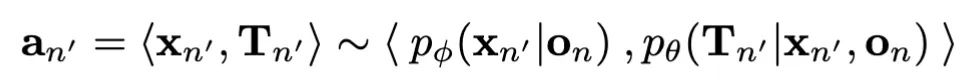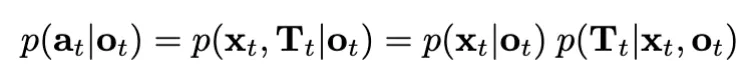 여기서 p(o_{t+1} \mid o_t, a_t) 는 point cloud dynamics를 나타내며, 이는 point cloud 관찰 o_t의 객체 x_t에 변환 T_t를 적용하는 것으로 모델링됩니다. 확률 p(a_t | o_t) 는 아래와 같이 분해될 수 있는데,