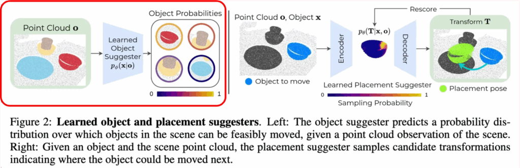 - 배치 제안자 (placement suggester): p_\theta(T_t \mid x_t, o_t)