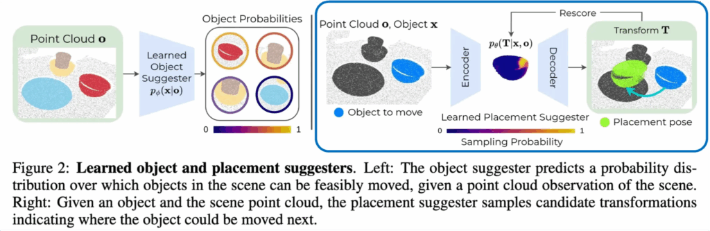 Placement Suggester는 특정 객체 x_t와 장면 o_t가 주어졌을 때, 객체를 다음 장면에 어디에 둘 수 있는지에 대한 잠재적인 SE(3) 변환 T_t들을 샘플링하여 제안하는 모듈입니다.