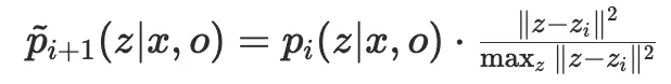 또 다양한 placement를 샘플링하기 위해(중복되는 placement 샘플링을 막기 위해) iterative rescoring 기법을 사용합니다. 매 반복마다 이전에 샘플링된 latent vector 주변의 샘플링 확률 분포를 줄이는 방식으로 rescoring을 적용합니다. 이는 아래 식으로 표현됩니다.