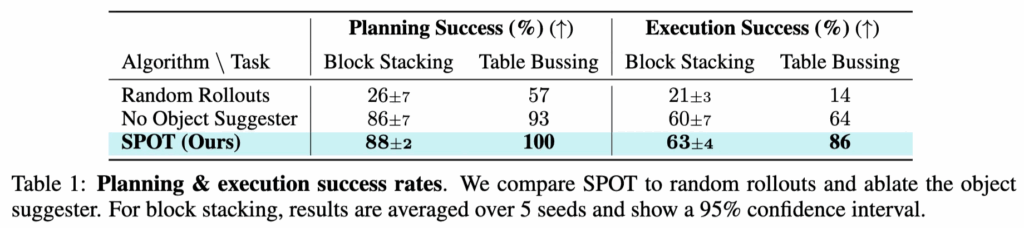 Table 1에서 SPOT은 블록 쌓기와 테이블 bussing 태스크 모두에서 높은 Planning Success와 Execution Success 을 기록했습니다. 특히 블록 쌓기에서 기존 방식인 Random Rollouts는 단순히 무작위 탐색에 의존했기 때문에 성공률이 26%에 불과했고, 객체 제안자(Object Suggester)를 제거한 경우에도 성능은 86% 정도에 머물렀습니다. 반면 SPOT은 88%의 안정적인 성능을 보여주며, 탐색과 객체 제안자의 결합이 효과적임을 보였습니다. 실제 실행 단계에서도 블록 쌓기에서 Random Rollouts는 21%에 불과했지만, SPOT은 63%까지 끌어올리는 모습이고, 테이블 bussing도 SPOT은 86%로, 다른 방법들과 큰 폭의 차이를 냈습니다.