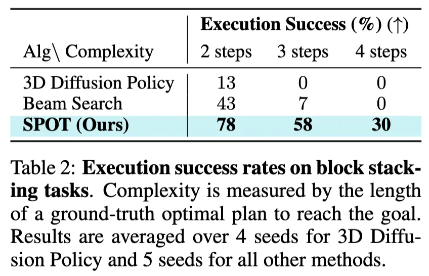 Table2는 블록 쌓기 태스크의 복잡도 즉 long-horizon manipulation에 대한 성능을 보여줍니다. 좀 신기한 건 단계 수가 늘어날수록 기존 기법들이 거의 0에 가깝게 실패한다는 것입니다. 3D Diffusion Policy는 2steps에서조차 13%에 불과했고, 3steps 이상에서는 전혀 성공하지 못했습니다. Beam Search 역시 3steps에서 7%, 4steps에서는 0%로 사실상 불가능에 가까웠습니다. 하지만 SPOT은 높은 성능을 보이는데요. 이는 long-horizon 태스크에서도 SPOT이 확실히 차별화된 강점을 가진다는 점을 보여줍니다.