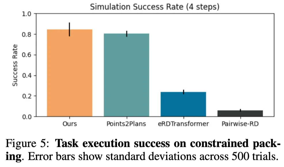 Figure 5를 보면 제한된 공간 패킹 과제에서 SPOT의 성능이 두드러집니다. SPOT은 약 84%의 성공률을 기록하며 Points2Plans를 소폭 앞질렀습니다. 반면 eRDTransformer나 Pairwise-RD 같은 기존 방법들은 각각 20%와 5% 미만으로 사실상 유효한 성능을 내지 못했습니다. 이 결과는 SPOT이 단순히 블록 쌓기 같은 구조화된 작업에만 강한 것이 아니라, 공간 제약이 큰 환경에서도 안정적으로 작동할 수 있음을 의미합니다.