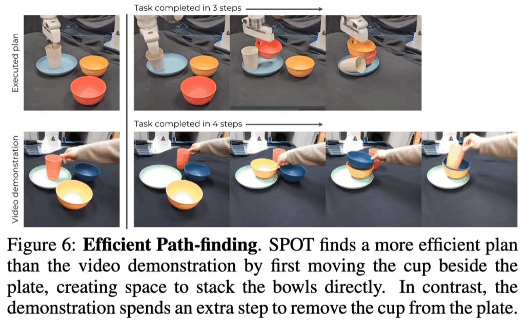 마지막으로 Figure 6은 특이하게 SPOT의 efficient한 path-finding을 보여주는 정성적 결과입니다. 테이블 bussing 태스크에서 인간의 시연은 컵을 치운 뒤 그릇을 차례로 쌓고 다시 컵을 올리는 방식으로 총 4단계가 필요했습니다. 하지만 SPOT은 컵을 접시 옆으로 옮겨 공간을 확보한 뒤 바로 그릇들을 쌓는 방식으로 단 3단계 만에 동일한 목표를 달성했습니다. 이는 SPOT이 단순히 인간 시연을 그대로 따라 하는 것이 아니라, 학습된 객체·배치 제안자에서 얻은 일반적인 분포를 활용해 더 효율적인 대안을 스스로 탐색할 수 있다는 점을 보여줍니다. 이 점이 좀 신기했던 점입니다. 사전학습 때 사용된 시연에서의 action 경향성을 따라가지 않으면서 효율적인 task 수행과정을 planning한다는 점에서 의미가 큰 것 같습니다.