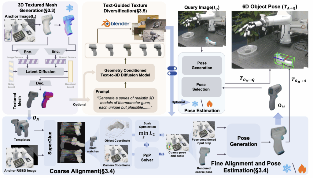 저자는 추가적으로 단일 이미지로부터 생성된 3D 모델과 실제 객체 사이의 외형적 차이, domain gap를 해소하기 위한 독창적인 방법으로 ‘텍스트 기반 텍스처 다양화’ 기법을 제안합니다. 이 접근법은 6D 자세 추정기의 강인함과 일반화 성능을 높이는 데 핵심적인 역할을 합니다.