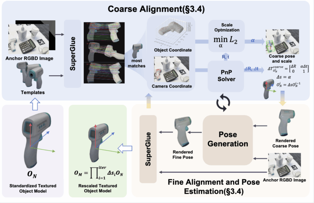coarse estimate 와 스케일 s부터 시작하여 FoundationPose 에서 조정된 네트워크를 사용하여 현재 자세에서 모델의 렌더링과 IA에서 관찰된 객체 간의 차이를 기반으로 점진적인 자세 업데이트 ∆R ∈ SO(3) 및 ∆t를 예측하여 추정치를 개선합니다. 즉 초기 포즈와 실제 앵커와의 R t를 조정을 Foundation pose에 맡기고 조정된 R,t를 통해서 조정된 뷰에서 다시 SuperGlue를 통해 반복해서 조절해 나갑니다. 그렇게 반복되서 얻은 O_{M} 을 앵커이미지로 가는 포즈를 획득 할 수 있다고합니다.