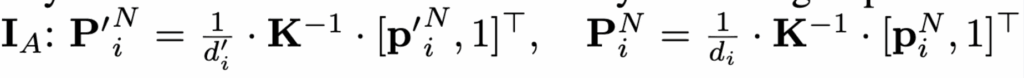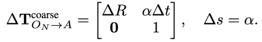 3D model인O_{N} 을 생성하였는데요 이는 정규화된 공간내에서 표현되기 때문에 실제 앵커이미지의 객체와는 스케일의 차이가 있을 것입니다. 이를 해결하기위해서 저자는 coars-to-fine하는방식으로 해결하는데요 우선은 만들어진 3D 모델에서 저희가 알고있는 카메라 내부파라미터를 K를 이용하여 n개의 구면시점에서 2D이미지로 렌더링 합니다. 렌더링된 뷰 o_{i}와 앵커이미지 I_{A} SuperGlue 매칭을 통해 가장 많이 매칭된 뷰만 남깁니다. 그렇게 되면 p_i' \in \mathbb{R}^2, \; p_i \in \mathbb{R}^2 각 2차원의 점들이 있을 겁니다 그럼 이제 각 렌더링된 뷰와 I_{A} 의 D depth정보를 활용하여 3 차원으로 변환해줍니다.P_i' \in \mathbb{R}^3, \; P_i \in \mathbb{R}^3 로 나타낼 수 있습니다.