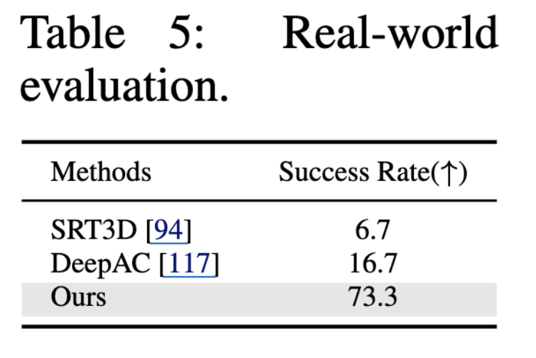 또한 저자들은 방법과 SRT3D 및 DeepAC를 비교하면서 각 작업에 대해 15개의 객체를 사용하여 30번의 시행을 거쳐 테스트했습니다.