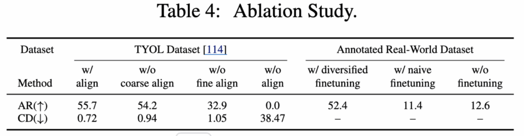 마지막으로 ablation 입니다. 저자들이 주장한 coarse – to – fine alignment에 대해서 성능입니다. 스케일이 안맞다보니 align을 맞춰주지않으면 AR이 0인것을 볼 수 있습니다. 하지만 초기포즈와 foundation pose의 조정을 통햇 성능이 향상되는 것을 볼 수 있습니다. 하지만 TYOL 데이터셋이 조명이나 저조도가 있어 어려운 데이터셋입니다. 그럼에도 SOTA를 달성한 것을 볼 수 있습니다. 텍스트를 이용한 데이터 증강 및 미세조정의 효과 역시 리포팅을 하는데요 이 실험은 저자들이 직접 구축한 실제 데이터셋에서 진행되었습니다. fine tuning 하지 않았을 때의 AR은 12.6%였습니다. 초기에 생성된 단일 3D 모델만으로 학습시킨 성능은 오히려 낮아졌는데요 텍스처를 가진 모델들을 생성하여 학습시킨 경우 AR이 52.4 상승했습니다.