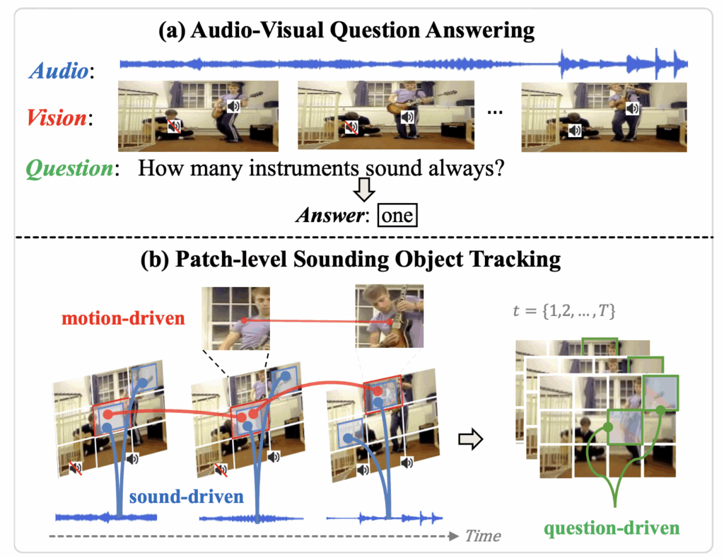 세번째로 여러 객체가 동시에 소리내는 경우, 단순히 모든 객체들이 소리를 낸다고 모든 객체에 구별력 없이 집중하는 것은 질문의 종류에 따라 오히려 노이즈가 될 수 있습니다. 즉 모델이 현재 답변해야하는 질문을 바탕으로 집중해야하는 패치를 분간할 수 있어야한다고 이야기합니다.