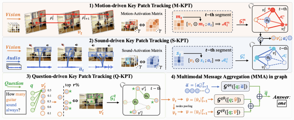 첫번째 포인트는 결국 오디오 단일 모달리티에 의존하여서는 AVQA를 해결하기 어렵다는 뜻으로 이해해볼 수 있습니다. 저자는 이에 따라 먼저 시각 정보에만 집중하여 인접 프레임 사이에서 움직임이 큰 패치를 잡아내는 Motion-driven Key Patch Tracking (M-KPT) 모듈을 제안합니다. 시각적인 움직임이 크다면, 해당 영역이 소리를 내는 객체이거나 질문과 유관할 확률이 높다는 전제 하에 동작하는 모듈입니다.