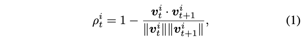여러 프레임에 걸친 특정 패치의 움직임을 보기 위해 optical flow 또한 쓸 수 있지만, 연산량이 너무 커 M-KPT 모듈에서는 동일 인덱스의 패치간 유사도를 계산합니다. i번째 패치에 대한 motion intensity \rho{}_{t}^{i}는 아래 수식 (1)과 같이 계산됩니다.