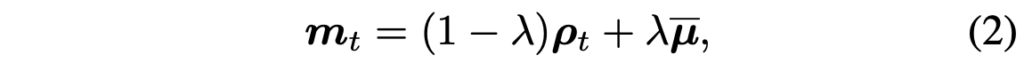 위 수식 (1)의 연산을 프레임 내 모든 패치에 적용하여 한 프레임의 intensity matrix \mathbf{\rho{}}_{t} = \{\rho{}_{t}^{i}\}_{i=1}^{N^2} 를 구할 수 있습니다. 이렇게까지만 계산하면, 일부 짧은 시간대에서만 움직임이 큰 객체는 그 짧은 시간대에서만 강조될 것입니다. 하지만 본 모듈의 목적은 움직임이 큰 객체를 시간 축 전 범위에서 강조해주는 것이기 때문에 그 목적을 위해 모든 프레임에서의 움직임 정도를 고려한 global motion intensity \bar{\mathbf{\mu{}}} = \frac{1}{T}\Sigma{}_{t=1}^{T} \mathbf{\rho{}}_{t}를 만들어줍니다. 이후 최종적인 각 프레임의 intensity matrix \textbf{m}_{t}는 아래 수식 (2)와 같이 하이퍼파라미터 \lambda{}=0.2로 가중되어 더해집니다.