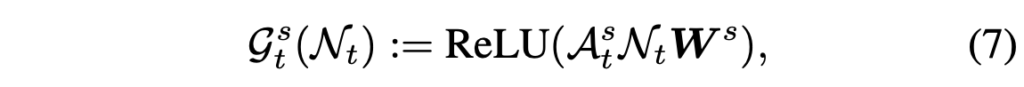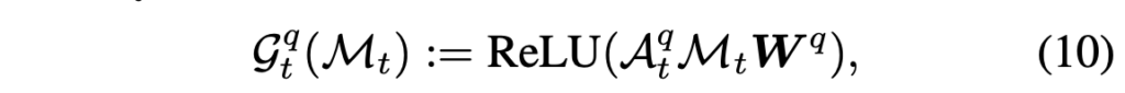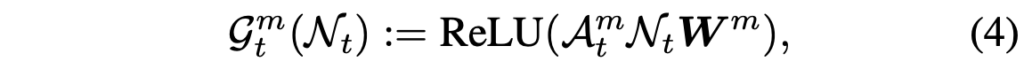 이후 각 프레임에서의 노드 \mathcal{N}_{t} = [v_{t};a_{t}] \in{} \mathbb{R}^{N^{2}+1} \times{} d를 만들어줍니다. 그럼 그래프 연산을 위한 노드 \mathcal{N}_{t}와 인접 매트릭스 \mathcal{A}_{t}^{m}를 얻었으니 아래 수식 (4)와 같은 그래프 연산을 수행해줍니다.