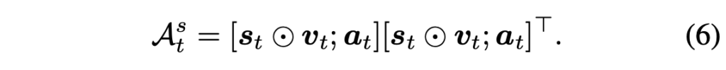 여기까지 하여 얻은 \textbf{m}_{t}는 N^{2}차원으로, 각 패치 영역에 대한 salient object의 가중치라고 볼 수 있습니다. 따라서 이를 원본 visual feature v_{t}에 원소곱(Hadamard product)한 뒤 오디오 feature a_{t}를 뒤에 concat 후 아래와 같은 형태의 motion-driven 인접 매트릭스 \mathcal{A}_{t}^{m} \in{} \mathbb{R}^{(N^{2}+1) \times{} (N^{2}+1)}을 만들어줍니다.
