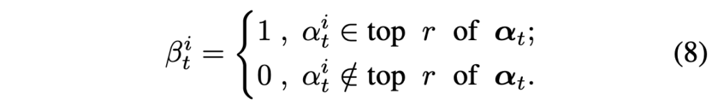 이 매트릭스에 대해 단어축으로 평균을 내어 sentence-level question-to-visual 유사도 \alpha{}_{t} \in{} \mathbb{R}^{N^{2}}를 구해줍니다. 질문과 유관한 패치만을 남기기 위해 아래 수식 (8)과 같이 유사도 기준 top-r%의 패치만을 남겨 그 값을 1로, 나머지 패치는 0으로 만들어 일종의 마스크 \beta{}_{t}를 만들어줍니다.