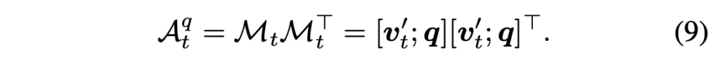 1로서 남아있는 N^{2} * r개의 패치 토큰만 이후 학습에 관여하여 나머지는 아예 학습에서 배제해주는 것이죠. \textbf{q}와 v'_{t}를 concat하여 노드 \mathcal{M}_{t}를 만들어주고, 스스로와의 곱을 통해 초기 인접 매트릭스 \mathcal{A}_{t}^{q} \in{} \mathbb{R}^{(K+N^{2}) \times{} (K+N^{2})}를 만들어줍니다. 이는 아래 수식 (9)와 같습니다.