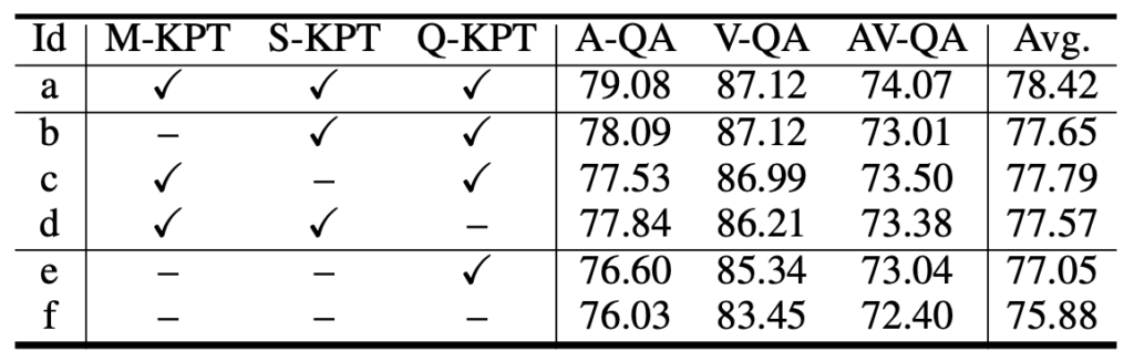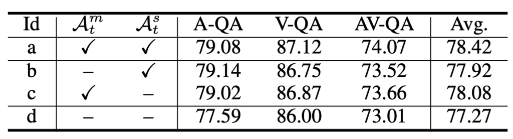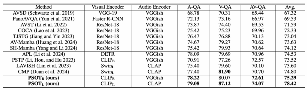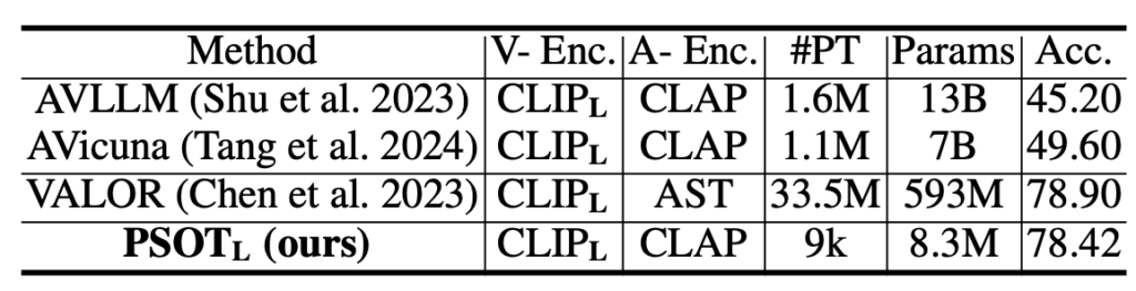 다음으로 표 2는 거대모델에 audio token을 projection하고 디코딩하여 fine-tuning을 진행하는 AVQA 방법론들과의 성능 비교입니다. 표 2의 타 모델들도 AVQA만을 위해 fine-tuning 되었다는 점을 감안하면 PSOT가 훨씬 적은 학습 데이터와 모델 사이즈임에도 높은 성능을 달성함을 알 수 있습니다.