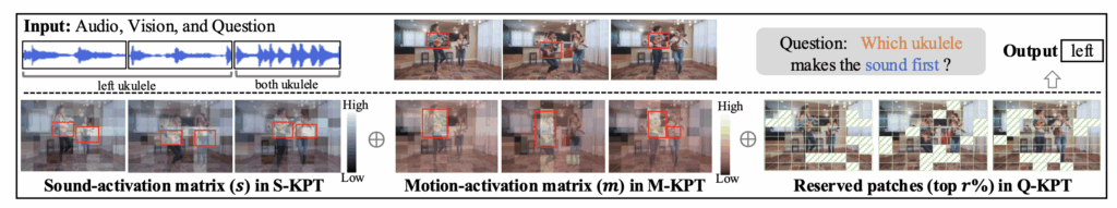 위 그림 3은 S-KPT 모듈에서 집중하는 ‘소리와 연관된 부분’, M-KPT 모듈에서 집중하는 ‘움직임과 연관된 부분’, 그리고 Q-KPT에서 집중하는 ‘질문과 연관된 부분’을 시각화한 것입니다.