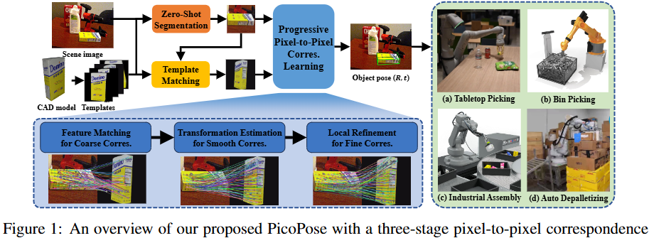 이번에 리뷰할 PicoPose는 바로 이 문제, 즉 RGB 이미지로부터 어떻게 하면 정확하고 강인한 대응점을 찾을 수 있을까 라는 질문에 Progressive Refinement 라는 아이디어로 접근하는 논문입니다. PicoPose는 총 3단계에 걸쳐 픽셀 단위의 대응점 정확도를 순차적으로 높이는 ‘점진적 픽셀 대 픽셀 대응점 학습’ 파이프라인을 제안합니다.